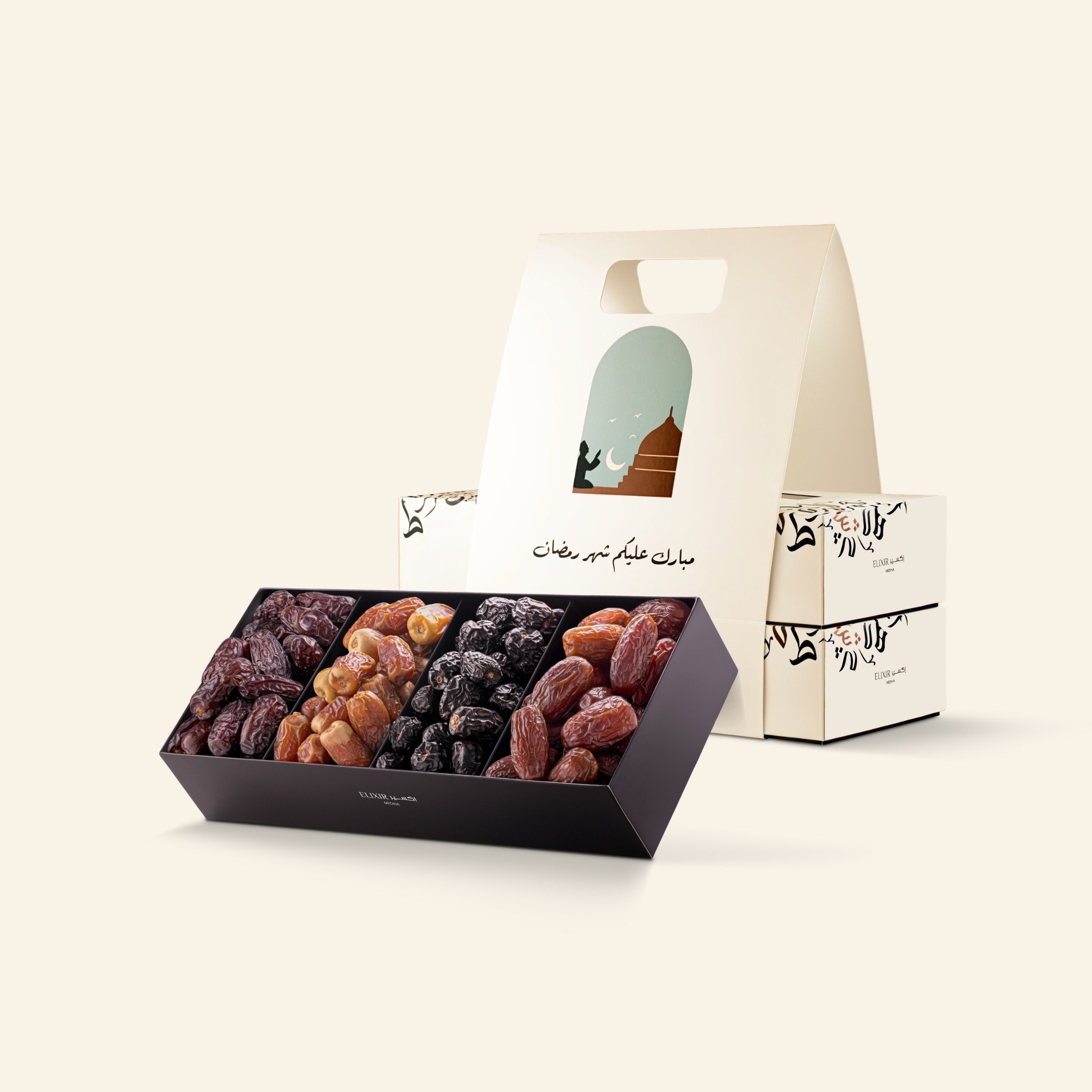 سلة رمضان من إكسير هدية فاخرة لرمضان من التمور العضوية المشكلة من أرض المدينة المنورة تتميز بجودة نادرة لا مثيل لها، تجمع بين الطراوة، النظافة، والطعم الفاخر في كل حبة